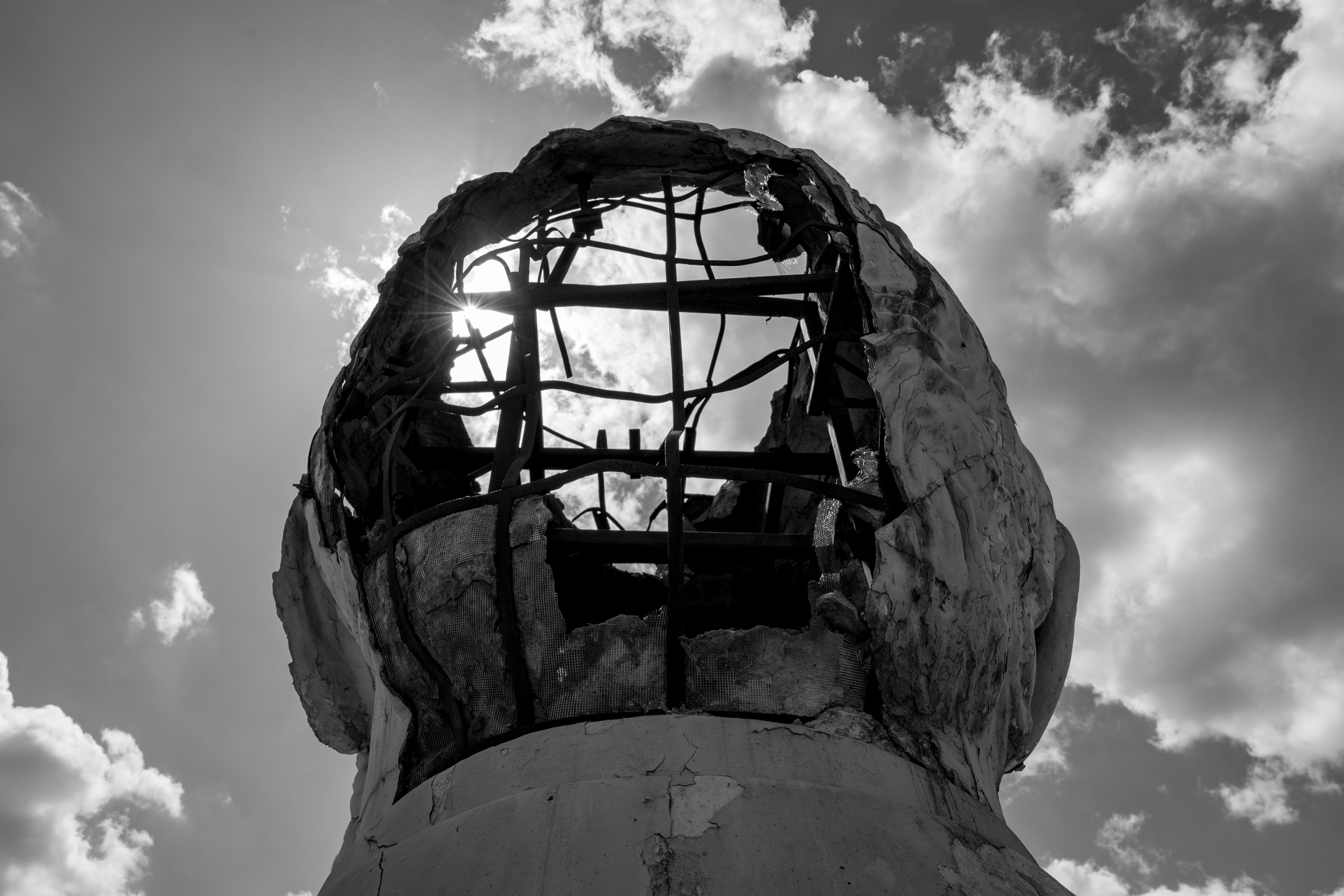 I spent an hour in that cluster with my cameras, moving through it, looking up. The afternoon light was falling from the front. It was exactly the right angle for that time of day. And the concrete faces were reading beautifully. Shadow pooling in the eye sockets. The cracked surfaces catching the light in ways that made them feel geological, ancient, like something the earth had made rather than something humans had built and then abandoned.
