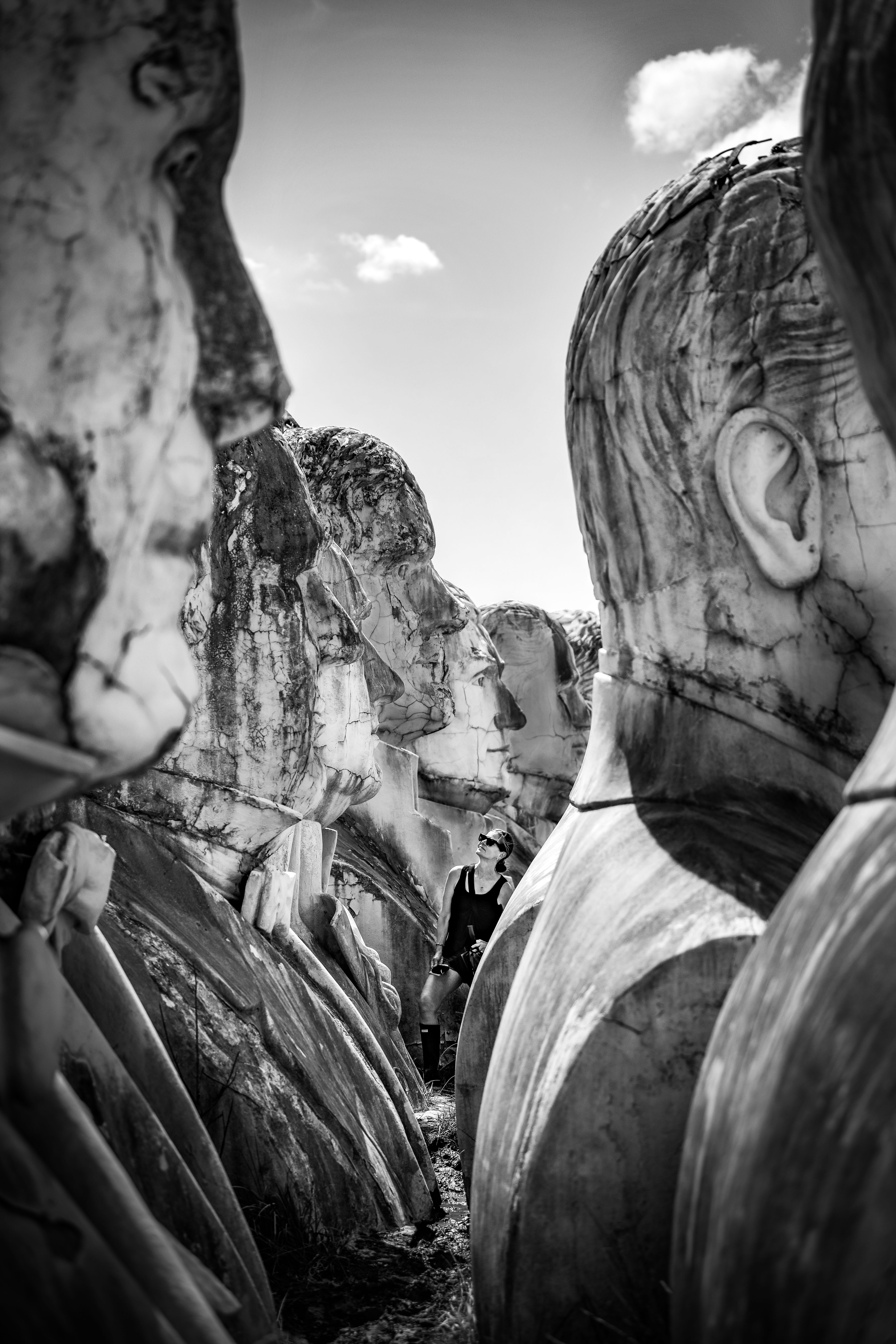 The image of Heather between the heads is like that. She was just moving through the same strange space I was, finding her own relationship to it, and for one 1/5000th of a second everything aligned. Her figure, the profiles in a row, the massive ear filling the right foreground, the cloud behind the middle heads…and the camera was already at my eye.