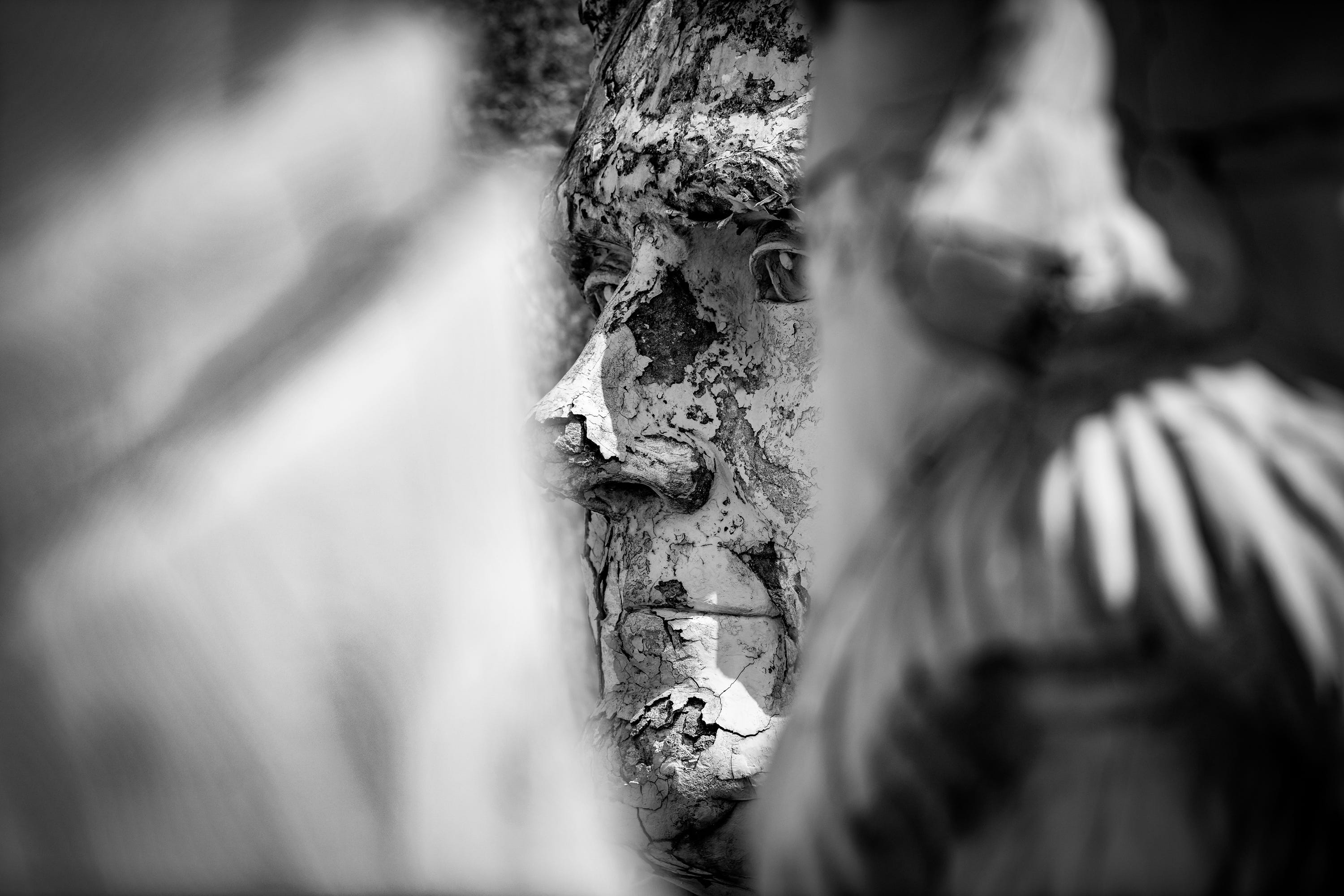 The sculptures are stranger in person than any photograph prepares you for. They sit in a tight cluster. Most of them pressed together like a crowd at a concert and with Washington, Jackson and Lincoln standing apart, watching from a distance. They’re crumbling. Moss climbs the cheeks of men who once ran the world. Cracks spider across foreheads. Entire sections of jaw and collar have given way to gravity and decay.
